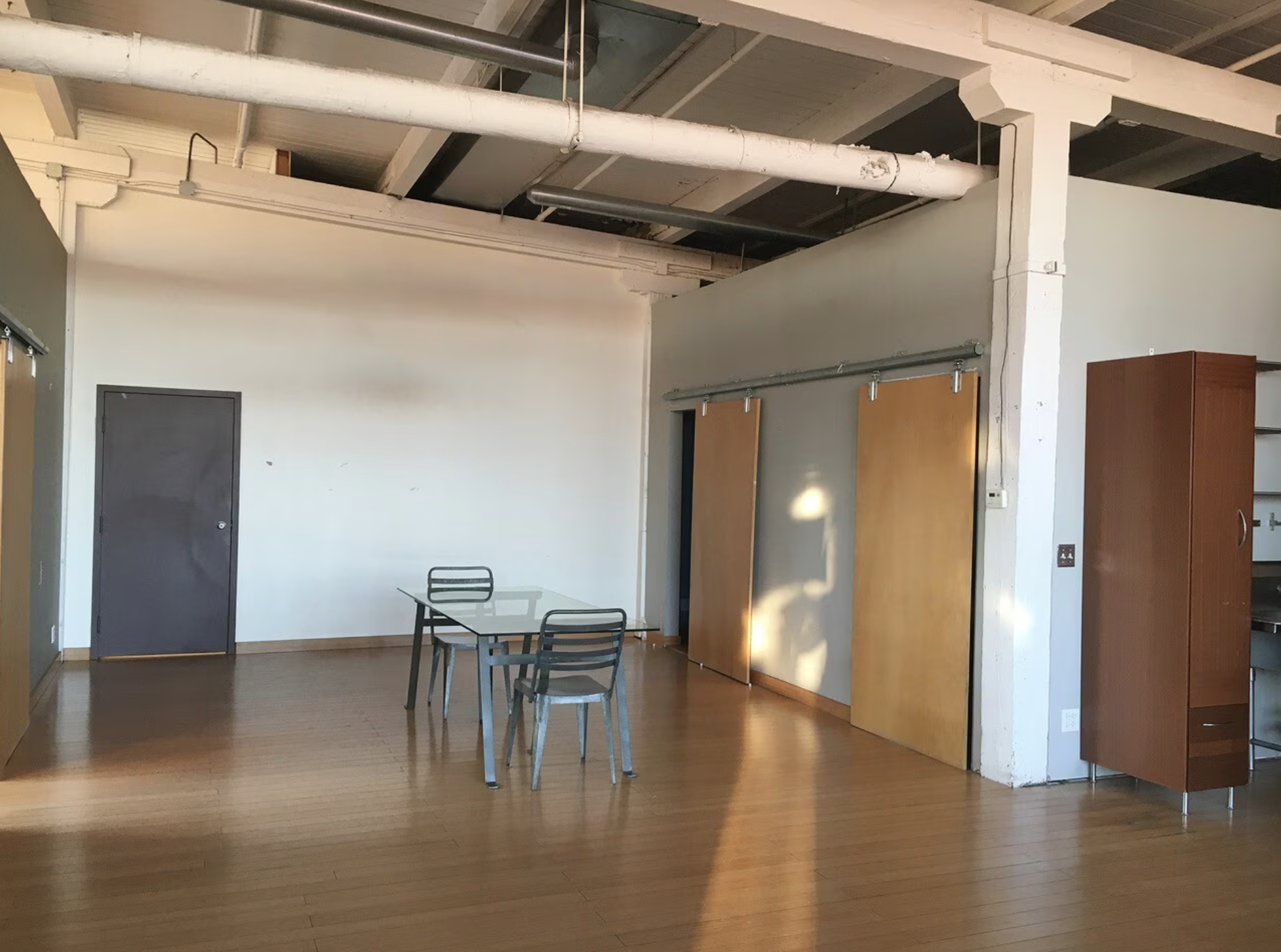 Spacious 3rd-floor unit with 15’ ceilings, kitchen, bathroom, and large open workspace. Great light and layout. Gated rooftop parking deck.
